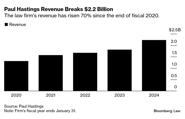 Paul Hastings boosted revenue 22% to more than $2.2 billion last year and saw profits jump as the firm hired partners from rivals more aggressively than most peers.