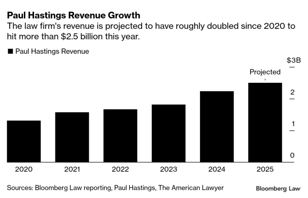 Last year, 17 firms took in more than $2.5 billion in revenue. To hit that figure, Paul Hastings will have roughly doubled its revenue since 2020, when it was the 27th largest US firm by revenue. Last year, it was the 22nd largest, according to data from The American Lawyer.