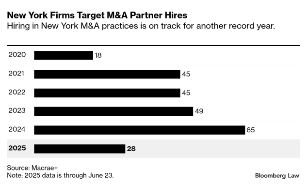 The 50 largest firms through mid-June hire 28 M&A partners in New York, according to recruiting firm Macrae, following a record 65 such moves in 2024. The record is in reach this year after firms announced a handful of New York M&A hires in late June, including Proskauer’s addition of former Paul Weiss partner Sarah Stasny.