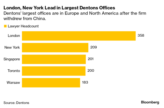 Dentons has acquired offices in India, the Philippines, and Africa since 2022. It also pulled out of China, slashing its professional headcount in half to under 6,000.