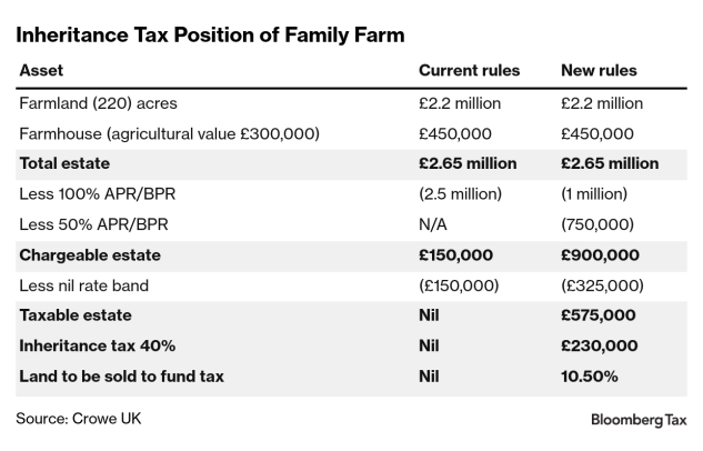 In this example, 10.5% of the farmland would need to be sold to pay the inheritance tax if there are no other assets. The example ignores the working capital of the farm (such as stock and farm machinery) and any possible uplift in value of the land due to development potential, both of which are often substantial and would only be eligible for 50% relief in this case, increasing the tax liability even more.