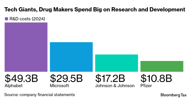 Alphabet had $49.3 billion in R&D costs in 2024. Deducting all R&D immediately means its future tax bills may be much less than its $19.7 billion tax provision last year. Google has lobbied Congress this year on “R&D amortization,” according to its disclosures.