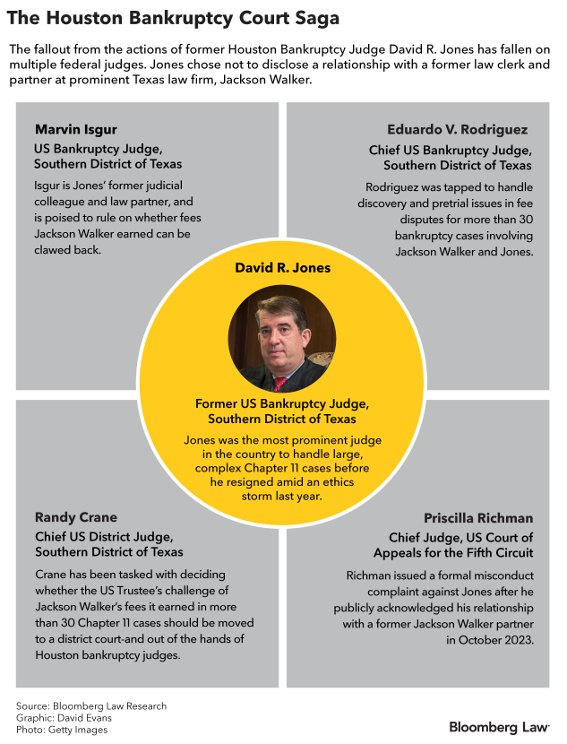 Standing outside his courtroom this month, Isgur told Bloomberg Law he couldn’t discuss the Jones controversy or the fee issue.