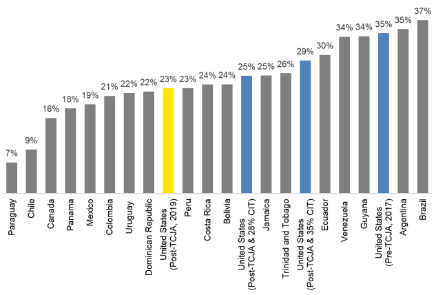 In 2017, before the TCJA was enacted, the U.S. was the third least tax-competitive country out of the 19 Americas Countries, with an effective tax rate on new investment of 34.6%. As of 2019, the U.S. was the ninth most tax-competitive country in the Americas, with an effective tax rate on new investment of 22.7%.