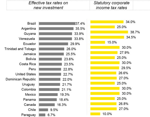 Figure 3. 2019 Effective tax rates on new investment and top statutory corporate income tax rates for 19 Americas Countries