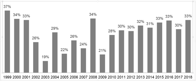 Figure 2. Americas’ share of worldwide FDI, 1999-2018