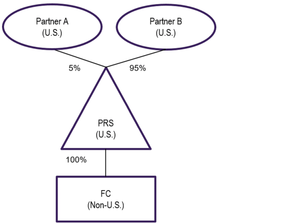 To illustrate the impact of the new regulations, let’s examine a simple fact pattern where a U.S. partnership, PRS, is owned by two partners, Partner A and Partner B. Partner A owns a 5% interest in PRS and Partner B owns a 95% interest in PRS. PRS wholly owns a controlled foreign corporation, FC. FC generated $10M of tested income and $10M of Subpart F income in the current year.