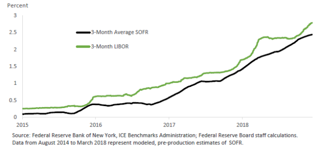 For example, the following figure compares 3-month LIBOR, one the most commonly used LIBOR benchmarks, to the 3-month simple average of SOFR.