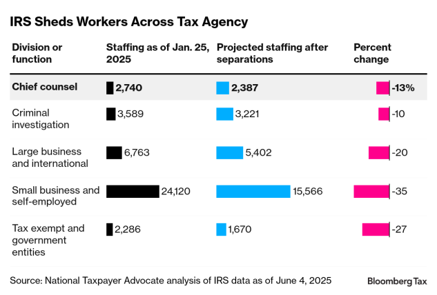 More than 350 staff members left the Office of Chief Counsel from January to early June, a decline of nearly 13%, according to the IRS National Taxpayer Advocate. Others have left since.