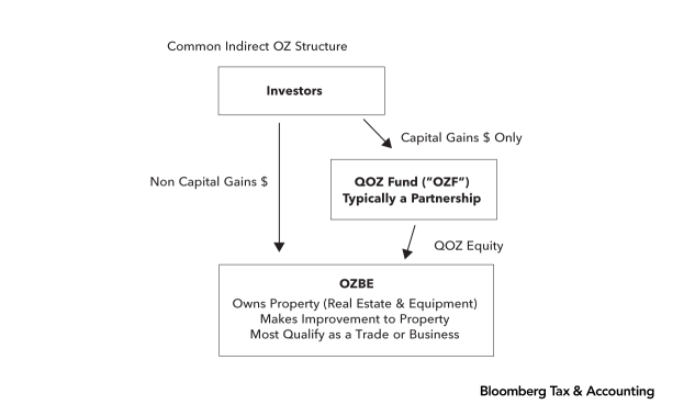 Taxpayers who wish to take advantage of these preferential capital gain tax rules must make their investments into OZs through an OZF. An OZF must be set up as either a partnership, a corporation or REIT for federal tax purposes. OZFs can invest directly in real estate. However, most OZ real estate transactions are implemented with an indirect investment structure involving an Opportunity Zone Business Entity (OZBE), as illustrated below.