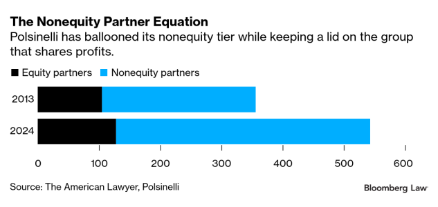 Polsinelli has doubled the size of its nonequity partner roster over the last 10 years, up to 502 lawyers. It has kept a lean equity partner roll, which increased by 11% during the same time.
