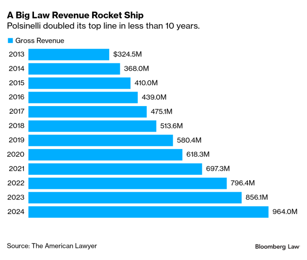 Polsinelli raked in more than $964 million in gross revenue last year, a 13% gain that’s in line with the expected average across large firms. Its profits per equity partner jumped by nearly a third, topping $2.5 million.