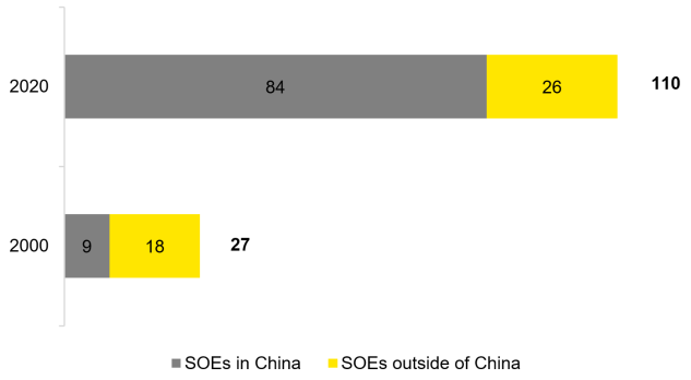 As shown in Figure 5, 110 of the FG500 companies are SOEs in 2020. This is a significant increase from the 27 SOEs in the FG500 in 2000. China accounts for a majority of these SOEs. Eighty-four of the 110 SOEs (76% of SOEs) were headquartered in China in 2020. By comparison, in 2000, only 9 of the 27 SOEs (33% of SOEs) were headquartered in China. Outside of China, SOEs in the FG500 are split between OECD (12 SOEs) and non-OECD (14 SOEs) countries. SOEs account for $8 trillion, or 24%, of the $33.3 trillion in 2020 FG500 company revenue.