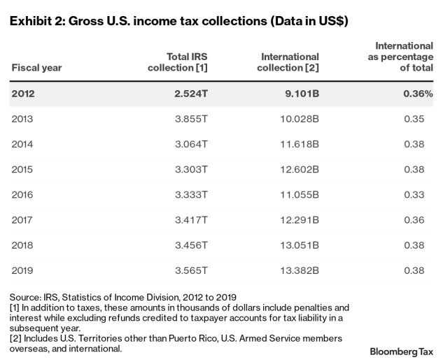 From 2012 to 2019, less than 1.2% of tax returns (Form 1040) were filed by U.S. citizens abroad (Exhibit 1). During the same period, their tax collection never went above 0.4% of the total internal revenue collection (Exhibit 2).