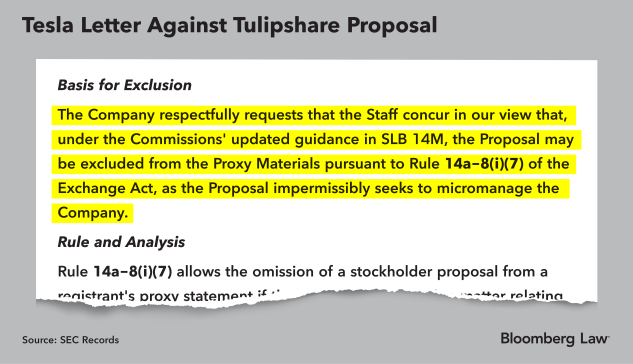 Tulipshare won battles at the SEC over proposals urging Amazon to have an independent audit of its warehouse workers’ treatment and pushing Tesla to integrate sustainability metrics into its executives’ compensation. The Tesla proposal has yet to go up for a vote. But the Amazon resolution received 22.5% of votes cast by the company’s shareholders, according to Bloomberg Intelligence.