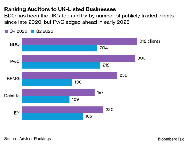BDO had been the UK’s largest auditor by number of publicly traded clients since late 2020, but PwC took the top spot in the most recent quarter of this year, according to Adviser Rankings Ltd. The researcher tracks the market for audit firms hired to vet corporate financial accounting.