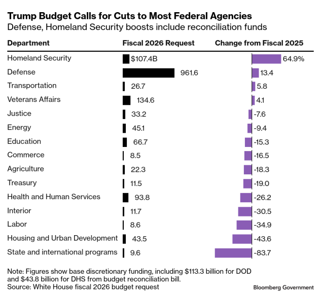 Trump aims to mostly do away with funding for the State Department and other foreign aid. State and international programs would receive $9.6 billion in fiscal 2026, down from $58.7 billion this year — an 83.7% drop. Those cuts are partly contingent on proposals to rescind old funds.