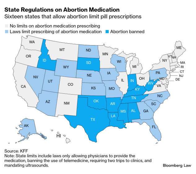 A total of 12 states completely ban abortion with limited exceptions, with 16 additional states limiting the prescribing or distribution of abortion-inducing medication, according to KFF. These restrictions include that only licensed physicians may prescribe the medication after in-person counseling.