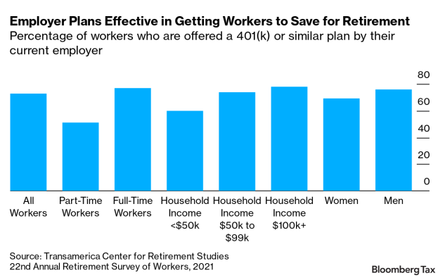 Employer-sponsored workplace retirement plans have proven to be the most effective way to engage workers to save for retirement—and to make them eligible to potentially benefit from the saver’s credit. According to the same survey findings, almost three out of four workers (73%) are offered a 401(k) or similar plan. Yet only 51% of part-time workers, 60% of workers with an HHI of less than $50,000, and 69% of female workers are offered a plan.