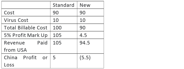 A question raised by clients is whether the costs associated with the virus should be included in the cost base and compensated by the U.S. parent. The answer is that multinationals may be able to take the position that the costs of the virus should be borne by the local affiliate. This action can reduce or even eliminate their China tax bill as illustrated by the example below: